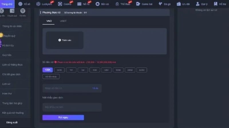 Bước 1: Đăng nhập vào tài khoản Xoso66 và truy cập vào mục Rút Tiền. Khi giao diện rút tiền xuất hiện, chọn Ví điện tử, nơi Xoso66 đã tích hợp các loại ví phổ biến trong hệ thống. Tại đây, bạn sẽ thấy danh sách các ví đang hỗ trợ và chỉ cần chọn đúng ví mình đang sử dụng.