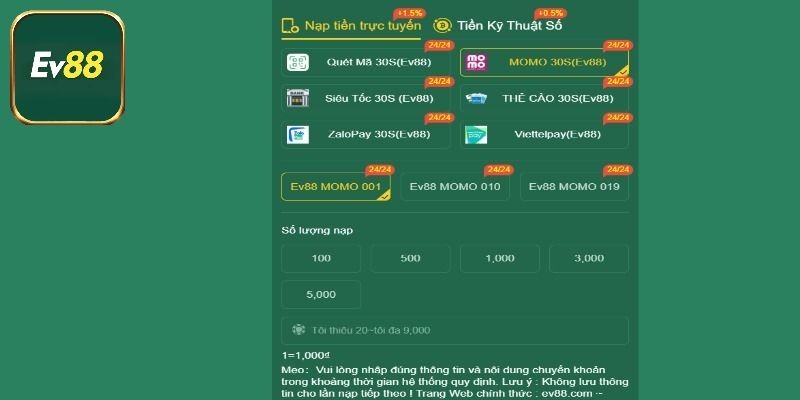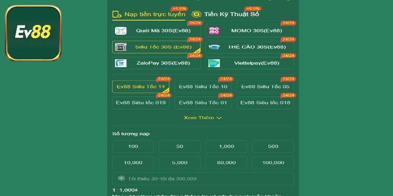 Quy trình nạp tiền EV88 được tối ưu thành nhiều hình thức nhằm tạo thuận lợi tối đa cho người dùng. Tùy theo thói quen bạn có thể chọn phương thức phù hợp nhất.