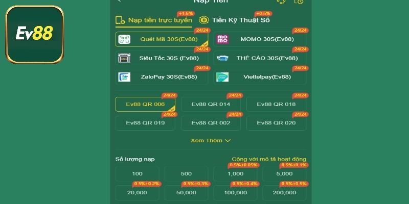 EV88 hỗ trợ nhiều loại ví phổ biến giúp người dùng nạp tiền nhanh và không cần đăng nhập ngân hàng. Ưu điểm của phương thức này là giao dịch diễn ra gần như ngay lập tức.